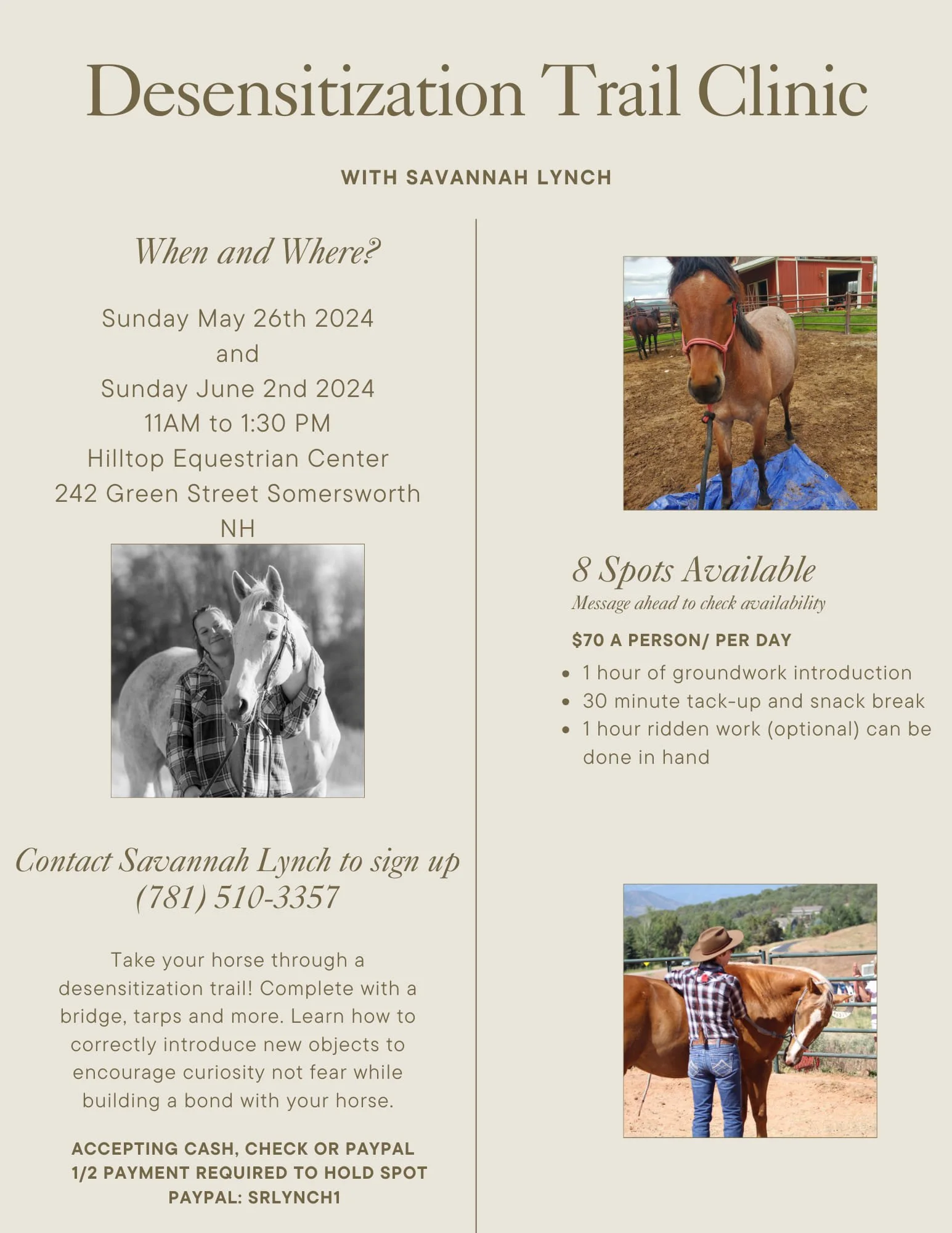 Join us at our upcoming Desensitization Trail Clinic for Horses on May 26th, 2024 and June 2, 2024 at Hilltop Equestrian Center. Our clinic is designed to help horses become more confident, calmer, and well-rounded individuals through specialized desensitization techniques.